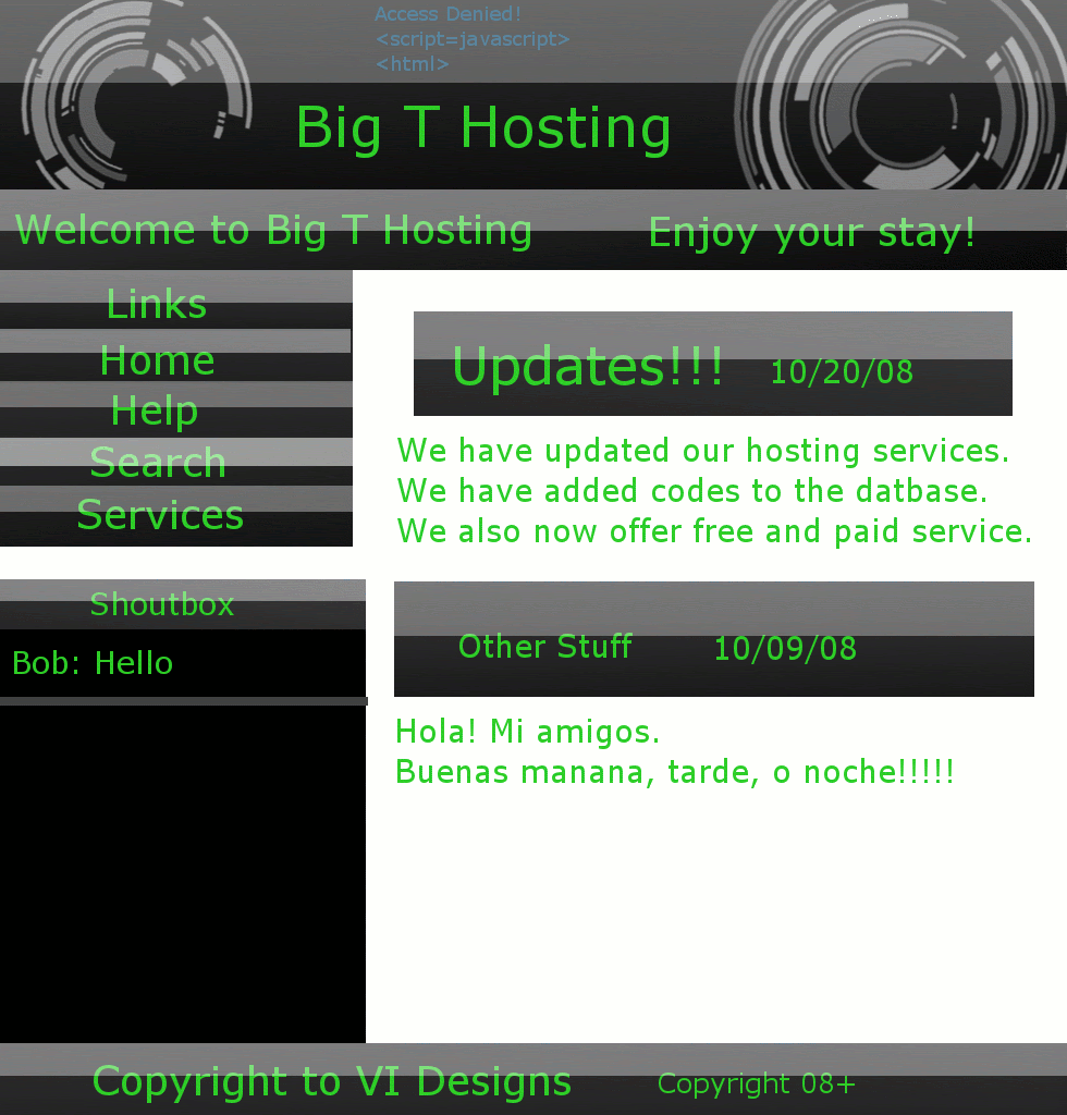 pm | Re: Big T Hosting Template (26th Mar 08 at 8:01pm UTC) | | I know that but the problem is I stink at interfaces and am trying to learn them. So it's kinda hard to make a cool one without stocks. ANyways do you know of any stock sites? | |